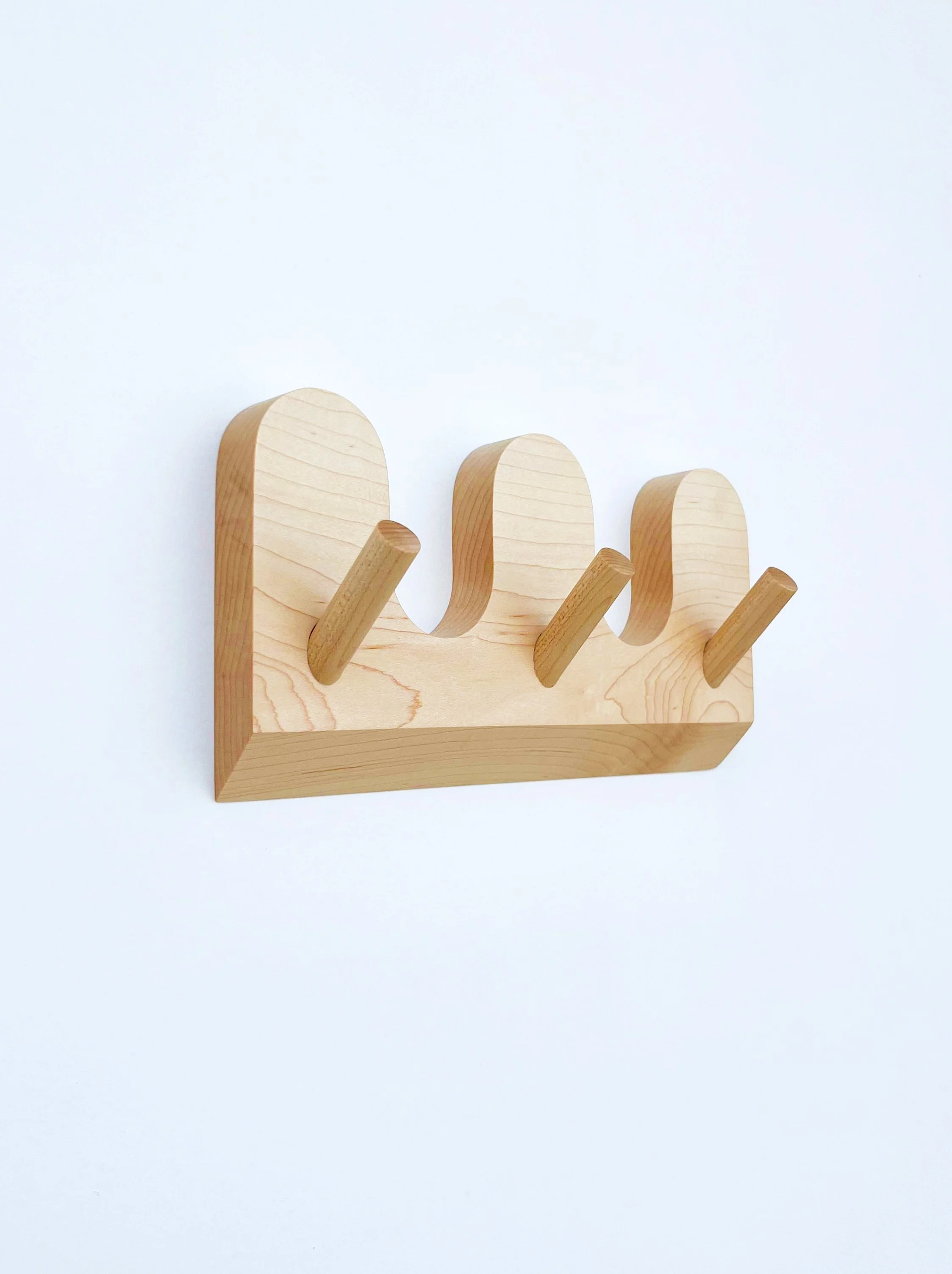 Handcrafted solid hardwood wall hooks made to order in our workshop in Red Hook, Brooklyn. We mill from rough boards, then shape, sand, and finish each piece all by hand. These come in your choice of three hardwoods: Maple (lightest tone), Oak (medium tone), or Walnut (darkest tone); and three sizes: 3 Hooks, 5 Hooks, or 7 Hooks. They have a gentle warmth that is perfect for modern kitchens, bathrooms, bedrooms, entryways or wherever else could use an easy landing spot. Finish is clear, satin-matte, and moisture resistant. Liquid will bead on the surface, and you can just wipe away with a cloth.